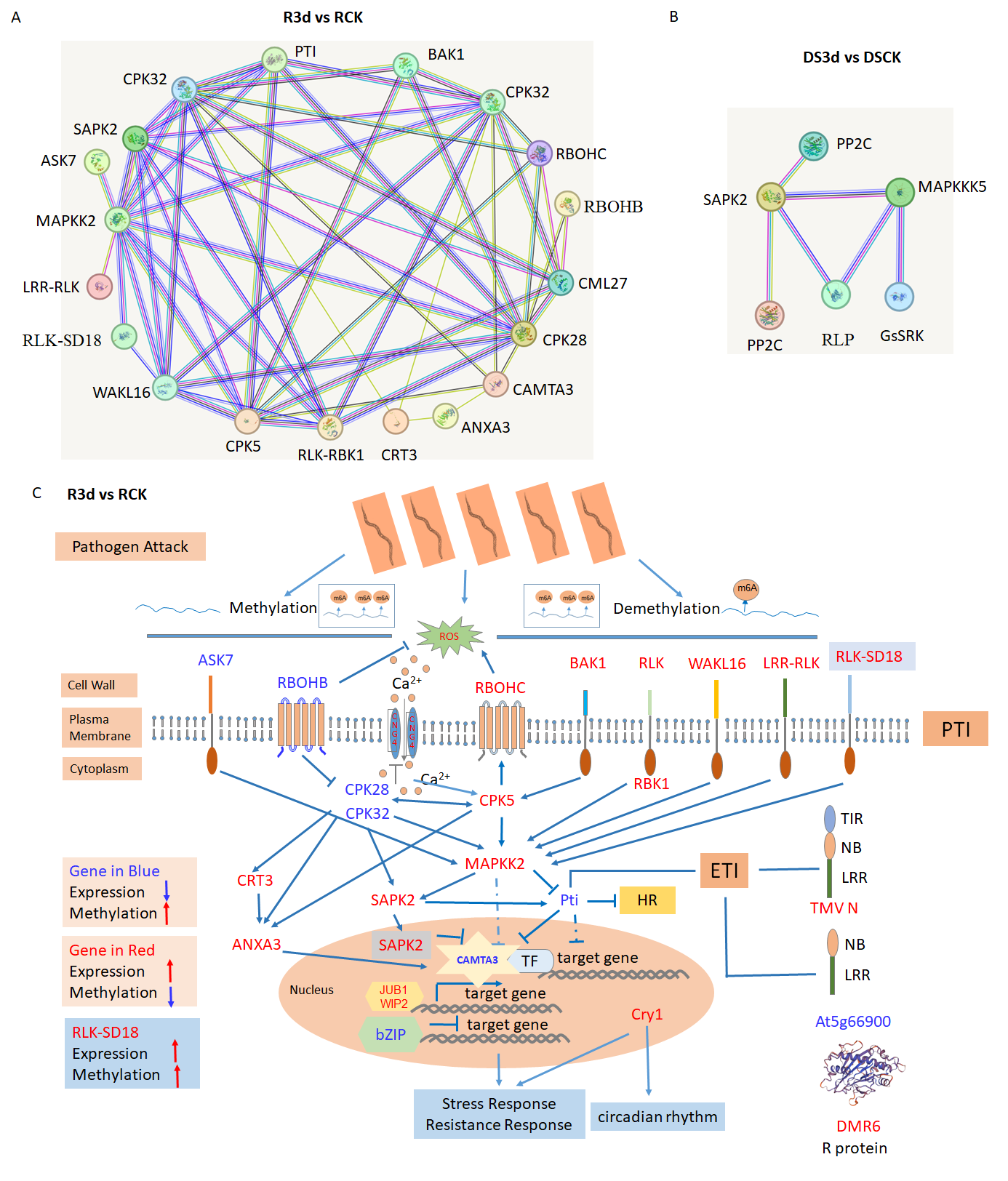 近日,東北地理所農田有害生物學科組李春杰研究團隊采用先進的m6A測序和RNA測序技術,探討了m6A修飾對基因表達和植物防御反應的影響。通過對大豆高抗品種和高感品種的對比研究,明確了m6A甲基化在大豆孢囊線蟲病抗感基因型中的分布及動態變化。結果表明,大豆孢囊線蟲侵染高抗品種后,上調和下調差異m6A峰(DMPs)的比例是1:22(205:4495);而在感病品種中,其比例接近1:1(1662:1774)(圖1)。該結果說明SCN的4號生理小種侵染抗病種質后能夠抑制大豆m6A甲基化修飾。結合轉錄組分析差異表達基因(DEGs)發現,關鍵的抗性和防御相關基因顯示出上調表達和甲基化被抑制,包括抗性R基因、受體激酶和轉錄因子等重要調控元件。相反,在高感品種中,與感病性相關基因的表達增加且甲基化減少,包括霉菌位點O樣蛋白(MLO)和影響防御機制的調控元件。通過對重疊的DMPs/DEGs基因的GO/KEGG富集分析,結合蛋白質-蛋白質相互作用,構建了抗病反應中的關鍵調控網絡模型(圖2)。在抗病品種中,有19個DMPs/DEGs互作,而感病品種中只有6個DMPs/DEGs互作。在抗病反應中,SCN侵染抑制了甲基化反應,卻促進了與細胞受體激酶相關基因和抗性基因的表達。該調控網絡模型(圖2)揭示了SCN侵染能夠抑制大豆m6A甲基化修飾,從而提高SCN防御相關膜受體和抗性基因的表達。甲基化模式與基因表達之間的動態相關性進一步解釋了大豆對SCN的抗感機制。此外,研究還揭示了m6A修飾、可變剪接、microRNA和基因調控之間的復雜相互作用可能共同調控大豆的抗感反應。以上研究結果不僅有助于深入理解植物-線蟲互作機制,還為開發新的線蟲防控策略提供了重要的理論基礎。