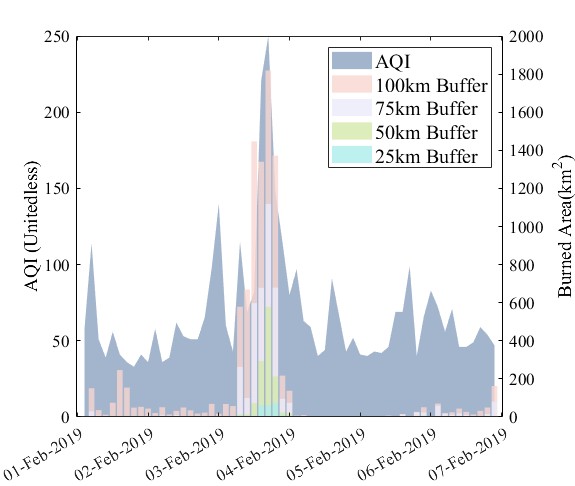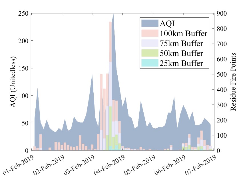 本研究通過提取可見紅外成像輻射儀(VIIRS)火點(diǎn)數(shù)據(jù)、中分辨率成像光譜輻射儀(MODIS)燃燒面積數(shù)據(jù),對(duì)比研究了這兩種不同秸稈焚燒參數(shù)與大慶市為中心不同緩沖區(qū)空氣質(zhì)量的相關(guān)性。