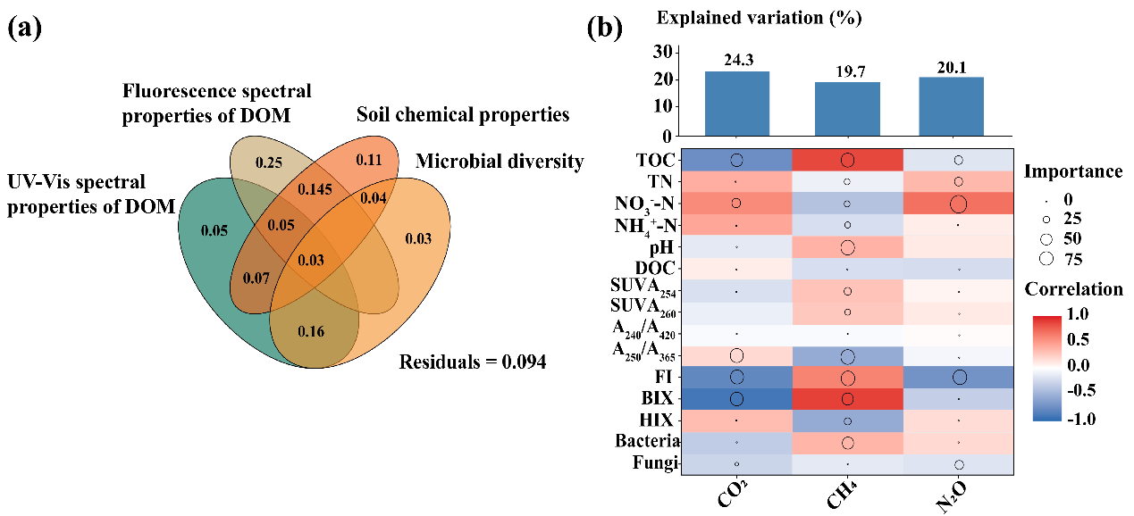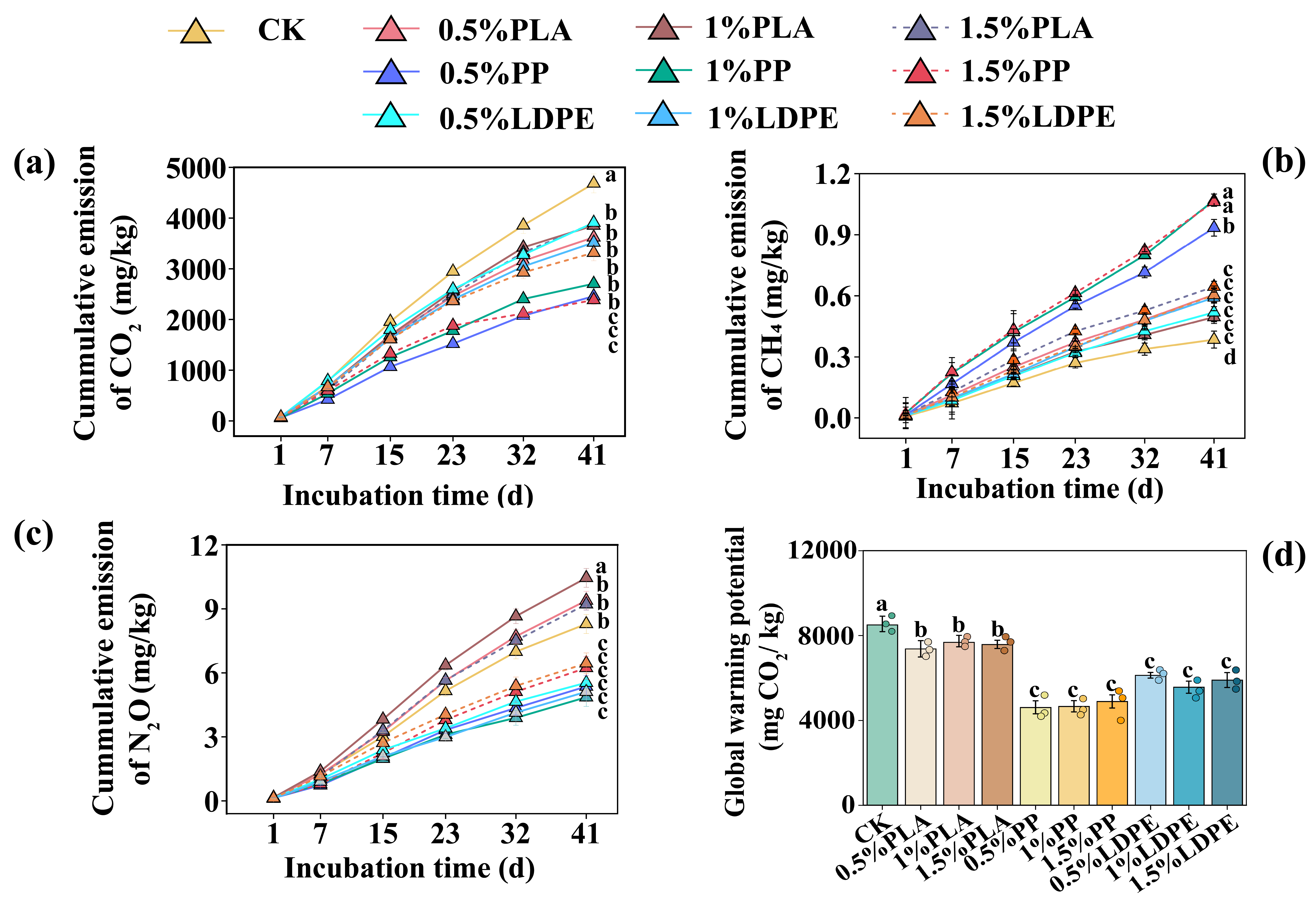 結(jié)果表明,不同類型的微塑料添加均顯著提高了土壤的碳養(yǎng)分與pH,但對(duì)土壤氮養(yǎng)分與DOM的化學(xué)多樣性的影響存在差異。三種微塑料添加均有效抑制了土壤CO2的累計(jì)排放量,其中低密度聚乙烯與聚丙烯添加能夠顯著抑制土壤N2O排放,降低全球增溫潛勢(shì)。DOM熒光特性、土壤化學(xué)性質(zhì)和微生物多樣性指數(shù)是解釋溫室氣體排放的關(guān)鍵指標(biāo)。