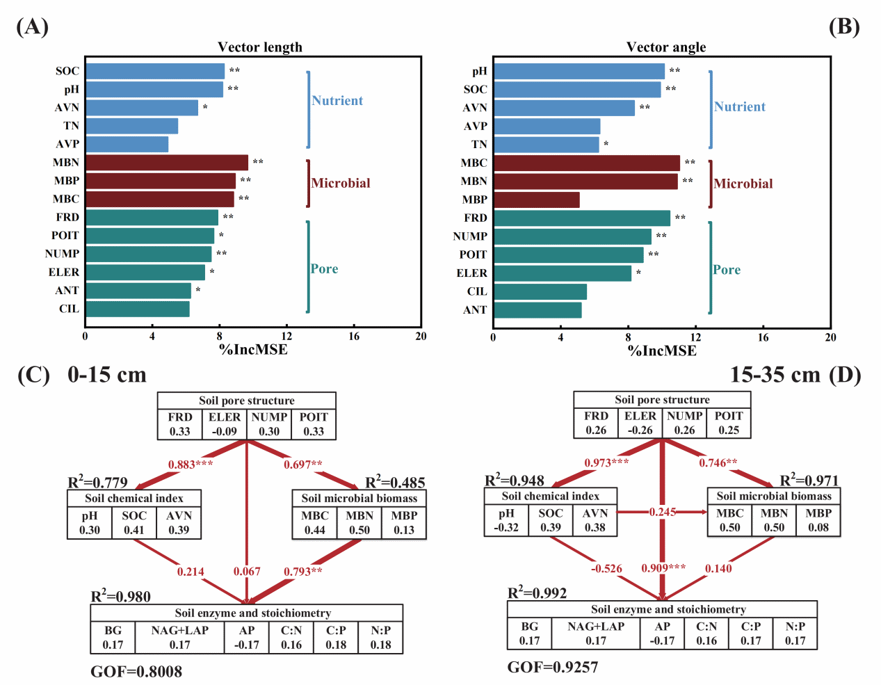 圖2. 土壤性質(zhì)對酶活性的影響和微生物資源限制與土壤性質(zhì)的關系