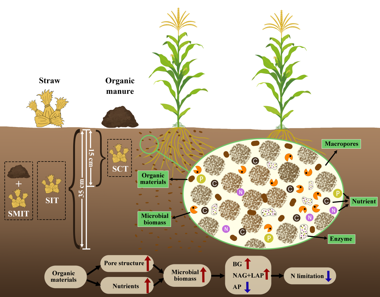 東北地理所黑土保護與利用學科組研究人員在黑鈣土地區(qū)通過有機物料還田與耕作深度結合的定位試驗,探究了有機物料類型與還田深度對土壤孔隙結構和土壤酶活性的影響,并分析了土壤結構特征對微生物量和微生物活性的影響機制,旨在為改善土壤孔隙結構和微生物活性進而增加農(nóng)田生態(tài)系統(tǒng)中碳氮的固存提供科學的見解。