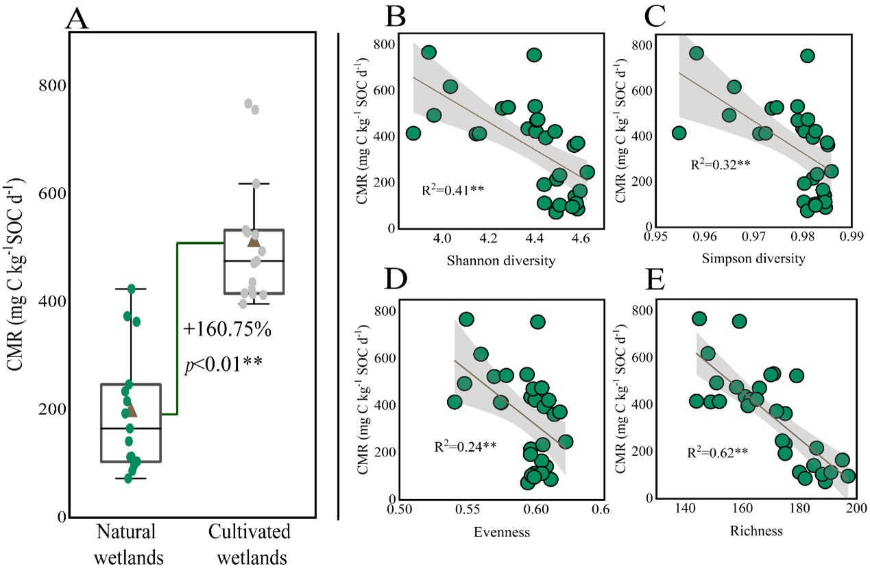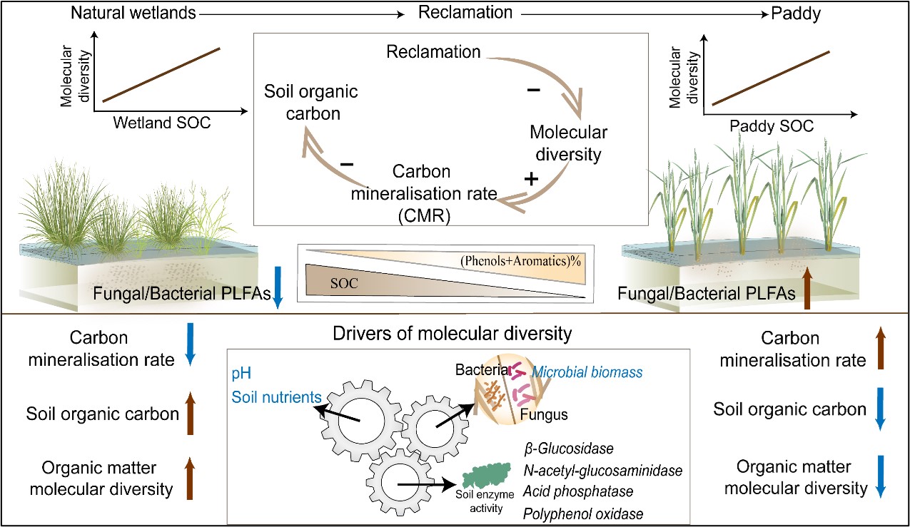 圖3 本研究的概念圖。在濕地和水稻田土壤中,分子多樣性隨著土壤有機碳含量的增加而增加。此外,盡管稻田土壤中存在較大比例的難分解碳,但土壤碳礦化速率仍在增加。概念模型揭示了濕地開墾對土壤碳庫可持續管理的潛在風險。