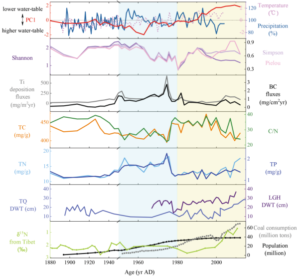 東北地理所濕地演化與生態功能學科組以大興安嶺北部宏圖(HT)泥炭地為研究對象,闡明過去150年來泥炭地硅藻組合特征和多樣性;基于硅藻重建歷史時期泥炭地水位變化,并結合地球化學代用指標,探討人類活動和氣候變化對泥炭地水文環境演變過程的影響。研究結果表明:1950年以前宏圖泥炭地水文環境演變主要受氣候影響,由于當地居民以狩獵和采集活動為主,泥炭地保持著原始狀態。1949年新中國成立后,由于人口快速增長、采礦業和工業等因素導致火災頻發,硅藻多樣性遭到破壞。1980年特別是2000年以后,耐高氮型硅藻種類(Achnanthidium minutissimum和Craticula molestiformis)的突然增加表明人類活動引起的氮沉降效應增強。20世紀80年代以來,煤炭燃燒、工業化、城市化和人口指數增長對大興安嶺地區泥炭地水文環境演化具有重要影響。工業生產和煤炭消耗造成的人為源排放增加了大氣氮沉降,宏圖泥炭地的水文環境不穩定(干旱和氮沉降增加)是由全球變暖和人為大氣排放共同造成的。人類活動對泥炭地的強烈影響在泥炭沉積物中留下了人類世的顯著地層學信號。