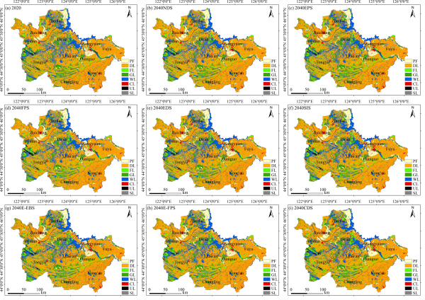 圖1 不同情景下土地利用的空間分布 (a)2020年;(b)2040年自然發展情景;(c)2040年生態保護情景;(d)2040年耕地保護情景;(e)2040年經濟發展情景;(f)2040年鹽堿地改良情景;(g)2040年生態經濟平衡情景;(h)2040年生態耕地保護情景;(i)2040年綜合發展情景(PF、DL、FL、GL、WL、CL、UL、SL分別表示為水田、旱地、林地、草地、濕地、建設用地、未利用地和鹽堿地,下同)