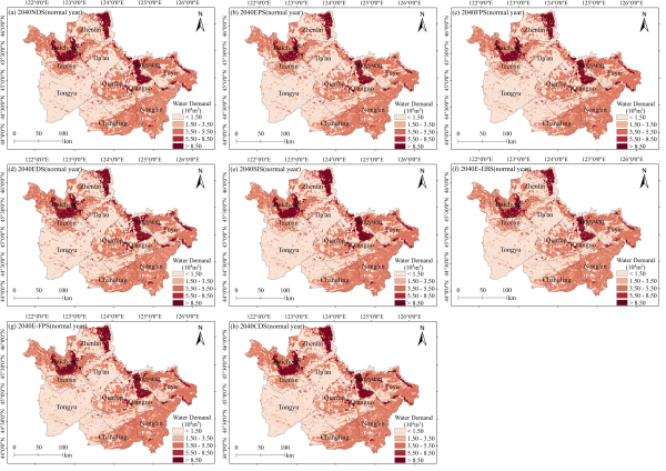 中國科學院東北地理與農業生態研究所科研人員選取了位于東北蘇打鹽堿集中分布區的吉林省西部,通過Plus模型設計了8種不同發展情景以探索符合吉林省西部未來土地利用規劃,并結合水文模型與作物系數法,在考慮枯水年和平水年的情況下,系統對比分析了2040年鹽堿地開發情景與其他7種發展情景下農業水資源供需的變化。研究結果表明:(1)通過有效的土地整治和改良措施,吉林省西部的鹽堿地問題有望得到顯著改善。特別是在鹽堿地改良情景和綜合發展情景中,到2040年鹽堿地面積將分別減少1188 km2和1709 km2(圖1、圖2)。(2)在傳統灌溉模式下,未來農業水資源供應(31.89×108~36.95×108m3)(圖3、圖4)無法滿足農業水資源需求(44.6×108~87.28×108m3)(圖5、圖6),枯水年份缺水的矛盾尤為突出。(3)農業水資源供需不平衡最嚴重的區域主要集中在水稻種植區(圖7)。高耗水作物種植面積的擴大將進一步加劇灌溉用水的壓力。在土地利用和降水變化的共同作用下,水資源供給的復雜性進一步加劇。本研究提出構建深度耦合的氣候-土地-水文模型,以應對未來氣候變化下農業水資源的挑戰,并通過構建“節水灌溉-種植結構優化-供水工程保障”治理模式,實現水資源高效利用和鹽堿地可持續開發的協同目標。研究可為吉林省“大水網工程”建設提供理論和技術支撐。
