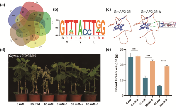 近日,東北地理與農業(yè)生態(tài)所農田有害生物控制學科組孟凡立研究團隊,利用轉錄組數(shù)據(jù)鑒定大豆堿脅迫(pH=9.1)處理0h、3h、6h、12h和24h的微外顯子序列,分析微外顯子序列特點和參與編碼的蛋白結構域(圖1),系統(tǒng)解析了鹽堿脅迫前后的大豆微外顯子動態(tài)變化。以AP2轉錄因子家族為例,創(chuàng)制了9bp微外顯子缺失以及正常轉錄本的轉基因大豆材料,結果表明微外顯子缺失在不改變蛋白質結構的條件下,增強大豆對鹽堿脅迫的耐受性(圖1)。該研究成果首次探究了微外顯子在大豆響應鹽堿脅迫的調控作用,為培育耐鹽堿大豆新品種提供新思路。
