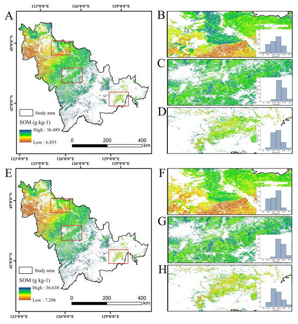 圖2. 吉林省土壤有機質(zhì)(SOM)空間分布全局與局部回歸模型預測結(jié)果比較。A:全局回歸模型預測的SOM空間分布圖。B~D:A圖中選取的典型區(qū)域。E:局部回歸模型預測的SOM空間分布圖。F~H:E圖中選取的典型區(qū)域。B~D和F~H圖中的條形圖分別表示各區(qū)域內(nèi)不同SOM含量的比例