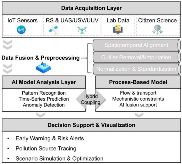 在全球城市化加速與氣候變化疊加影響下,水污染問題日趨嚴峻,傳統(tǒng)水質(zhì)監(jiān)測手段因響應滯后、覆蓋范圍有限和應對突發(fā)事件能力不足,已難以滿足當前水環(huán)境治理需求。人工智能(AI)技術的快速發(fā)展為解決這一問題提供了新路徑。中國科學院東北地理與農(nóng)業(yè)生態(tài)研究所水環(huán)境健康與模擬學科組在綜述性研究中提出,通過整合AI與物聯(lián)網(wǎng)(IoT)、遙感(RS)及無人監(jiān)測平臺(UMP)等技術,構建混合建模框架,有助于提升實時水質(zhì)監(jiān)測精度與效率,拓展數(shù)據(jù)獲取范圍,并實現(xiàn)多源異構數(shù)據(jù)的融合與智能分析。