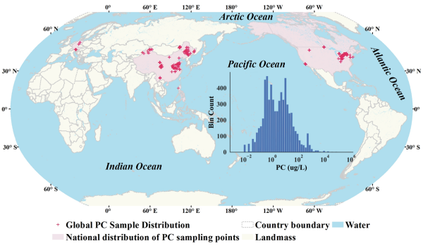 圖1 全球藻藍(lán)蛋白(PC)樣點(圖中紅色+)和頻率分布(直方圖)