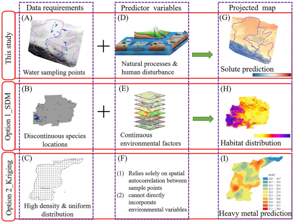 該研究系統(tǒng)采集了淺層地下水、深層地下水和地表水樣本,建立了包含地形、氣候、水力聯(lián)系、土壤特性和人類(lèi)活動(dòng)等五大類(lèi)環(huán)境因子的多維數(shù)據(jù)庫(kù)。創(chuàng)新性地將溶質(zhì)濃度類(lèi)比為生態(tài)系統(tǒng)中的物種"適生性",利用SDM模型模擬其在地下水系統(tǒng)中的空間分布規(guī)律。通過(guò)引入端元混合分析(EMMA)、隨機(jī)森林和AICc模型選擇等先進(jìn)算法,有效解決了野外觀測(cè)數(shù)據(jù)不足的難題,預(yù)測(cè)精度較傳統(tǒng)空間插值方法(如克里金法)提升30%以上。