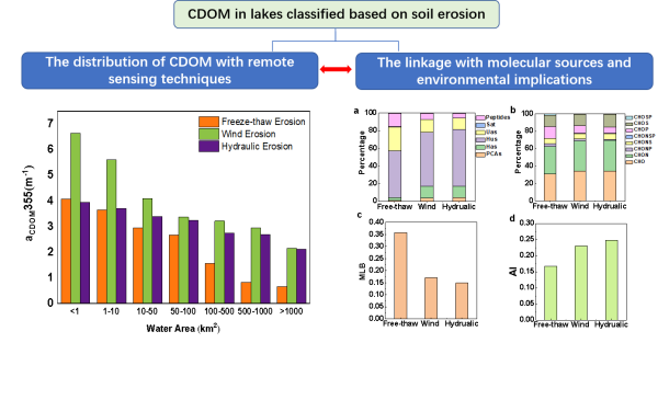 本研究通過XGBoost機(jī)器學(xué)習(xí)算法并結(jié)合Google Earth Engine(GEE)平臺(tái)獲取的Landsat 8衛(wèi)星遙感影像構(gòu)建了CDOM吸收遙感模型,模型表現(xiàn)良好(RMSEXGB,cal = 0.87 m?1, RMSEXGB,val = 0.94 m?1),并對(duì)2020年非冰期中國(guó)地區(qū)大于0.1 km2湖泊的CDOM吸收系數(shù)進(jìn)行了空間制圖。研究發(fā)現(xiàn),在不同土壤侵蝕區(qū)域下,湖泊aCDOM(355)平均值存在顯著差異,對(duì)于凍融侵蝕區(qū)域,隨著侵蝕強(qiáng)度的增加,CDOM吸收顯著增加,而風(fēng)蝕和水蝕區(qū)域則呈現(xiàn)相反的關(guān)系(p < 0.05)。本研究中發(fā)現(xiàn)隨著湖泊的水域面積增加,湖泊的aCDOM(355)顯著下降。不同侵蝕區(qū)域湖泊中CDOM的影響因素和分子組成特征具有顯著的差異特征(圖1)。該研究從宏觀和微觀視角相結(jié)合的角度豐富了對(duì)全球碳循環(huán)的理解。