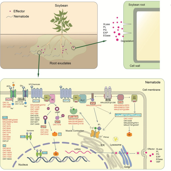 近日,東北地理所農(nóng)田有害生物控制學(xué)科組在多年研究積累的基礎(chǔ)上,從線蟲(chóng)生態(tài)行為、信號(hào)轉(zhuǎn)導(dǎo)和代謝響應(yīng)等層面解析了線蟲(chóng)聚集行為對(duì)寄主物種間的差異、分子調(diào)控機(jī)制及其生態(tài)學(xué)意義,為構(gòu)建線蟲(chóng)病害綠色防控體系和推動(dòng)根際微生態(tài)研究提供了新思路與技術(shù)途徑。研究以大豆和南方根結(jié)線蟲(chóng)為研究對(duì)象,結(jié)合預(yù)寄生階段(處理5h)線蟲(chóng)的轉(zhuǎn)錄組與植物根系分泌物的代謝組數(shù)據(jù),首次構(gòu)建了線蟲(chóng)由感知植物信號(hào)到進(jìn)入“侵染準(zhǔn)備”狀態(tài)的分子響應(yīng)圖譜。共發(fā)現(xiàn)846個(gè)差異表達(dá)基因,其中GPCRs、NHRs、AChRs等趨化感知相關(guān)基因顯著上調(diào),表明線蟲(chóng)已啟動(dòng)預(yù)侵染程序。特別是59個(gè)候選效應(yīng)子中有58個(gè)在未侵入植物前上調(diào),涉及Pl、Exp、Xyl、Eng、Vap等關(guān)鍵效應(yīng)子,表明線蟲(chóng)能僅靠根系信號(hào)提前激活寄生的機(jī)制。此外,線蟲(chóng)在預(yù)寄生階段表現(xiàn)出代謝重編程,溶酶體功能基因上調(diào),解毒通路如P450和GST下調(diào),資源重新分配以支持寄生活動(dòng)。同時(shí),線蟲(chóng)的行為也反向影響植物根系代謝物,說(shuō)明雙方在早期即存在復(fù)雜的雙向調(diào)控機(jī)制(圖1)。研究成果發(fā)表在Phytopathology,并被評(píng)為第115期“Editor’s Picks”(圖3)。