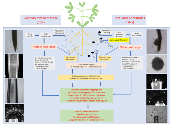 圖2 大豆孢囊線蟲(chóng)和南方根結(jié)線蟲(chóng)集聚行為的差異、與寄主范圍的關(guān)聯(lián)及生態(tài)學(xué)調(diào)控策略示意圖