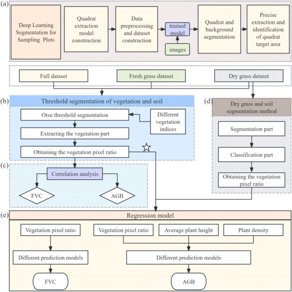 針對(duì)這一挑戰(zhàn),東北地理與農(nóng)業(yè)生態(tài)研究所鹽堿地資源與利用學(xué)科組的研究人員成功開(kāi)發(fā)出一套基于智能手機(jī)RGB圖像和深度學(xué)習(xí)的全新無(wú)損估算方法,顯著提升了AGB與FVC的評(píng)估效率和精度。研究團(tuán)隊(duì)在中國(guó)吉林西部草甸草原采集了574張智能手機(jī)RGB圖像(圖1),并通過(guò)結(jié)合U-Net神經(jīng)網(wǎng)絡(luò)與凸包掩膜自動(dòng)識(shí)別1m × 1m樣方區(qū)域,將圖像分割精度從61.8%顯著提升至90.1%。研究比較了多種植被指數(shù),發(fā)現(xiàn)植被顏色指數(shù)(CIVE)在草地圖像中的表現(xiàn)最為穩(wěn)健,在鮮草樣地中FVC與AGB的相關(guān)系數(shù)分別達(dá)0.85與0.54。為應(yīng)對(duì)干草與土壤之間的光譜混淆問(wèn)題,特別是在干草占比超過(guò)10%的圖像中,團(tuán)隊(duì)提出“先分割后重分類”的新流程,引入了TurboPixels超像素、邊緣引導(dǎo)分水嶺分割與k均值聚類等圖像處理技術(shù),顯著提升了分類準(zhǔn)確性(圖2)。