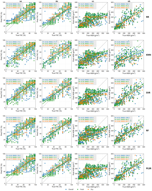 建模過(guò)程中,研究采用了五種主流回歸算法(嶺回歸、k近鄰、支持向量回歸、隨機(jī)森林和偏最小二乘回歸),并分別在兩組輸入變量上開(kāi)展訓(xùn)練。結(jié)果表明,對(duì)鮮草和干草分別建模,平均可提升模型決定系數(shù)(R2)0.23,最大降低均方根誤差(RMSE)達(dá)41%。其中,融入植被高度信息對(duì)提升AGB估算精度尤為關(guān)鍵,最優(yōu)模型R2可達(dá)0.62(圖3)。該研究所提出的技術(shù)框架僅依賴輕量化RGB影像和低成本計(jì)算資源,具備實(shí)地實(shí)時(shí)應(yīng)用的巨大潛力,為多尺度草地遙感監(jiān)測(cè)與生態(tài)評(píng)估提供了新的可靠工具。