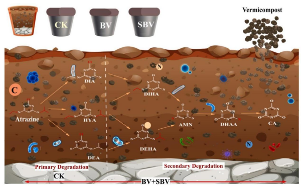 研究團隊通過室內(nèi)盆栽實驗,結(jié)合高通量測序、液相色譜-質(zhì)譜聯(lián)用(LC-MS)和冗余分析(RDA)等技術(shù),系統(tǒng)分析了蚯蚓糞堆肥和牛糞堆肥對黑土中農(nóng)藥降解效率、微生物群落結(jié)構(gòu)及其代謝路徑的影響,并對比了不同土壤類型(黑土與鹽堿土)中堆肥的作用差異。研究明確了關(guān)鍵環(huán)境因子與微生物代謝的耦合機制,具體發(fā)現(xiàn)包括:蚯蚓糞堆肥雖未顯著提升莠去津母體的去除率,但使其初級代謝產(chǎn)物(HYA、DIA、DEA)總量降低了38.67%,并檢測到5種次級降解產(chǎn)物(如DIHA、CA等),表明其加速了莠去津的深度降解。添加蚯蚓糞堆肥使乙草胺降解率提高10.81%,半衰期縮短至8.41天,并顯著改變了細菌群落組成。在黑土中添加4%(質(zhì)量比)牛糞堆肥,可使咪唑乙煙酸降解率提高12.58%,半衰期縮短53.37%。對比發(fā)現(xiàn),土壤類型是影響修復(fù)效果的關(guān)鍵因素:在鹽堿土中,牛糞堆肥反而抑制了咪唑乙煙酸的降解。