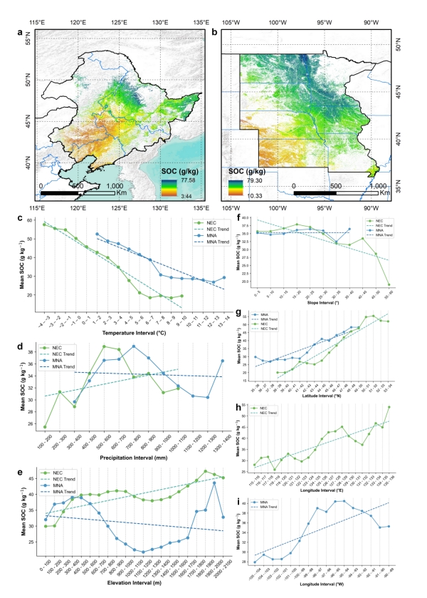 土壤有機(jī)碳(Soil Organic Carbon,SOC)在全球碳循環(huán)中發(fā)揮著關(guān)鍵作用,是全球最大的陸地有機(jī)碳庫(kù)。然而,關(guān)于中國(guó)東北黑土區(qū)(NEC)和北美密西西比河流域黑土區(qū)(MNA)SOC含量的空間分布格局及其與環(huán)境因子(氣候、地形等)的關(guān)系仍不清晰,制約了跨區(qū)域碳管理與精準(zhǔn)保護(hù)的科學(xué)支撐。