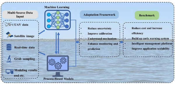 圖1. 耦合多源數(shù)據(jù)、機(jī)器學(xué)習(xí)與過程模型的水質(zhì)監(jiān)測、預(yù)測、管理協(xié)同框架圖