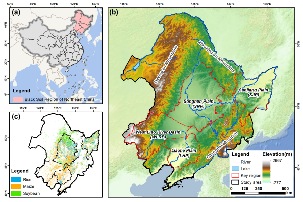 圖1 研究區(qū)及重點區(qū)域圖(a. 東北黑土區(qū)位置圖;b. 重點區(qū)域分布圖;c. 東北黑土區(qū)糧食種植分布圖)