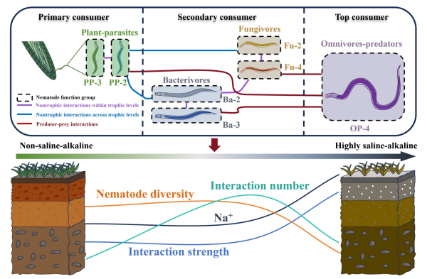 研究團隊沿鹽堿梯度設置了非鹽堿化、弱鹽堿化、中度鹽堿化和高度鹽堿化四個等級的土壤樣點。通過將線蟲按取食行為和生活史策略劃分為不同功能群,并根據(jù)各功能群所處生態(tài)位進一步將功能群間的相互作用劃分為三類:營養(yǎng)級內非營養(yǎng)相互作用、跨營養(yǎng)級非營養(yǎng)相互作用以及捕食者-被捕食者相互作用,系統(tǒng)構建了線蟲功能群網(wǎng)絡。
