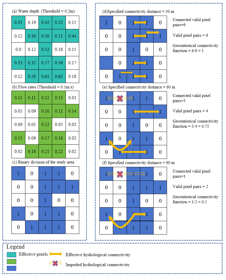 圖1 連通性函數計算示意圖(有效像素對是指空間中由特定向量(距離和方向)分隔的一對網格單元,其中兩個像素均具有有效數據值;地統計函數表示在給定距離內沿特定方向連接的有效單元的比例,表征水平面上各點之間形成水文連通性的可能性。)