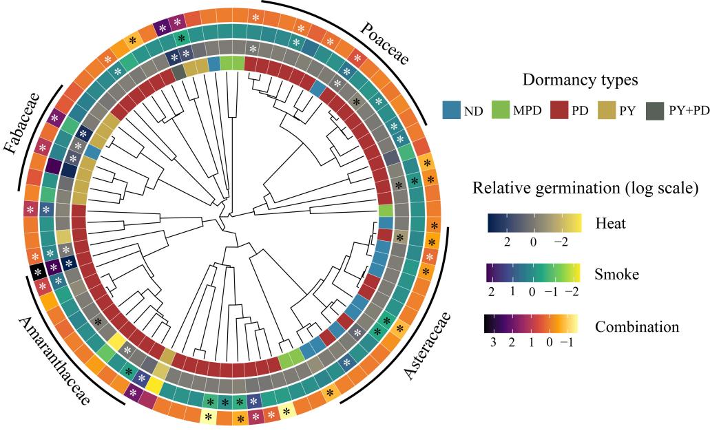 研究發(fā)現(xiàn),供試的80個(gè)物種中,有24個(gè)物種的種子萌發(fā)受到火干擾信號(hào)的顯著促進(jìn),其中11個(gè)物種對(duì)熱激處理表現(xiàn)出顯著響應(yīng),13個(gè)物種對(duì)煙信號(hào)表現(xiàn)出顯著響應(yīng)。然而,這些萌發(fā)響應(yīng)并未表現(xiàn)出顯著的系統(tǒng)發(fā)育信號(hào)。研究進(jìn)一步闡明,種子休眠類型與解除休眠所需的特定火干擾信號(hào)密切相關(guān),且一年生與多年生物種在對(duì)火干擾信號(hào)的萌發(fā)響應(yīng)上表現(xiàn)出顯著差異。以上結(jié)果表明,植物是否對(duì)火敏感,并不依賴于它們的親緣關(guān)系,而更多地取決于繁殖性狀。盡管整體萌發(fā)率的提高幅度有限,但物種及功能群對(duì)火干擾信號(hào)的差異性響應(yīng)揭示了野火在重塑群落結(jié)構(gòu)與組成中的潛在重要性。該研究為深入理解溫帶草原火后植被恢復(fù)機(jī)制提供了新的科學(xué)依據(jù),也為草地生態(tài)系統(tǒng)的管理與恢復(fù)提供了理論支撐。