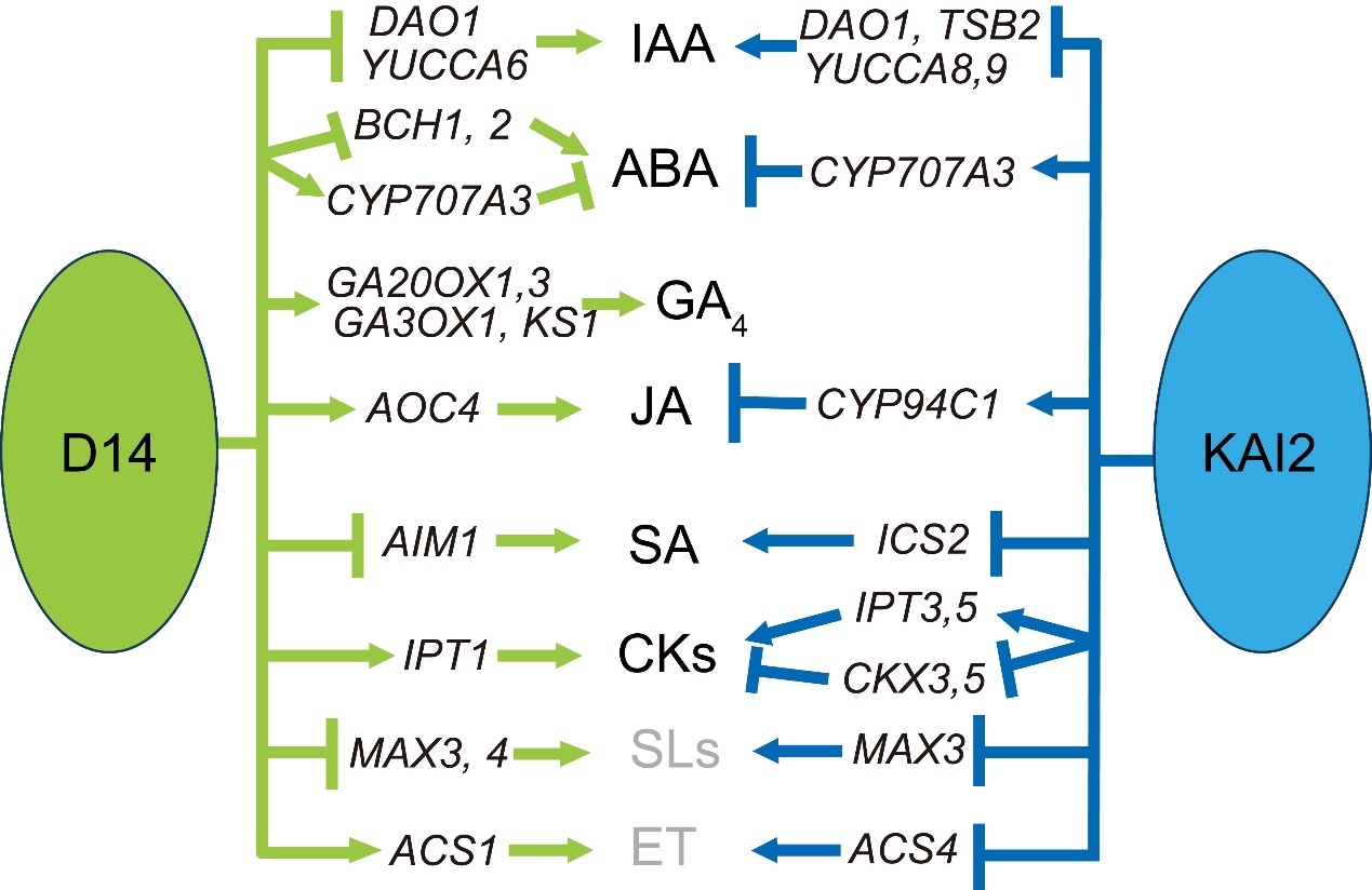 圖3. 擬南芥D14與KAI2調控激素含量及代謝基因表達的模型