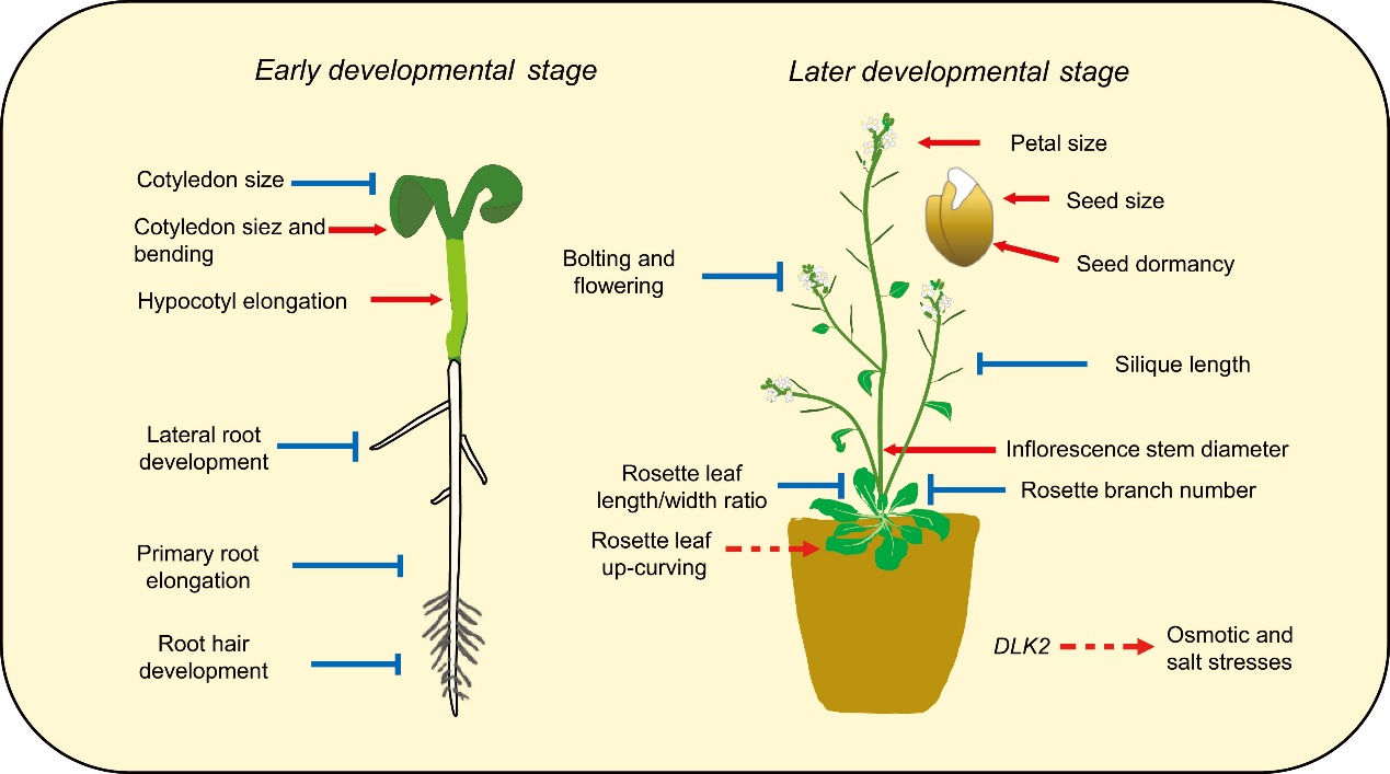 圖5. 擬南芥DLK2參與植物發育和抗逆響應的調控模型