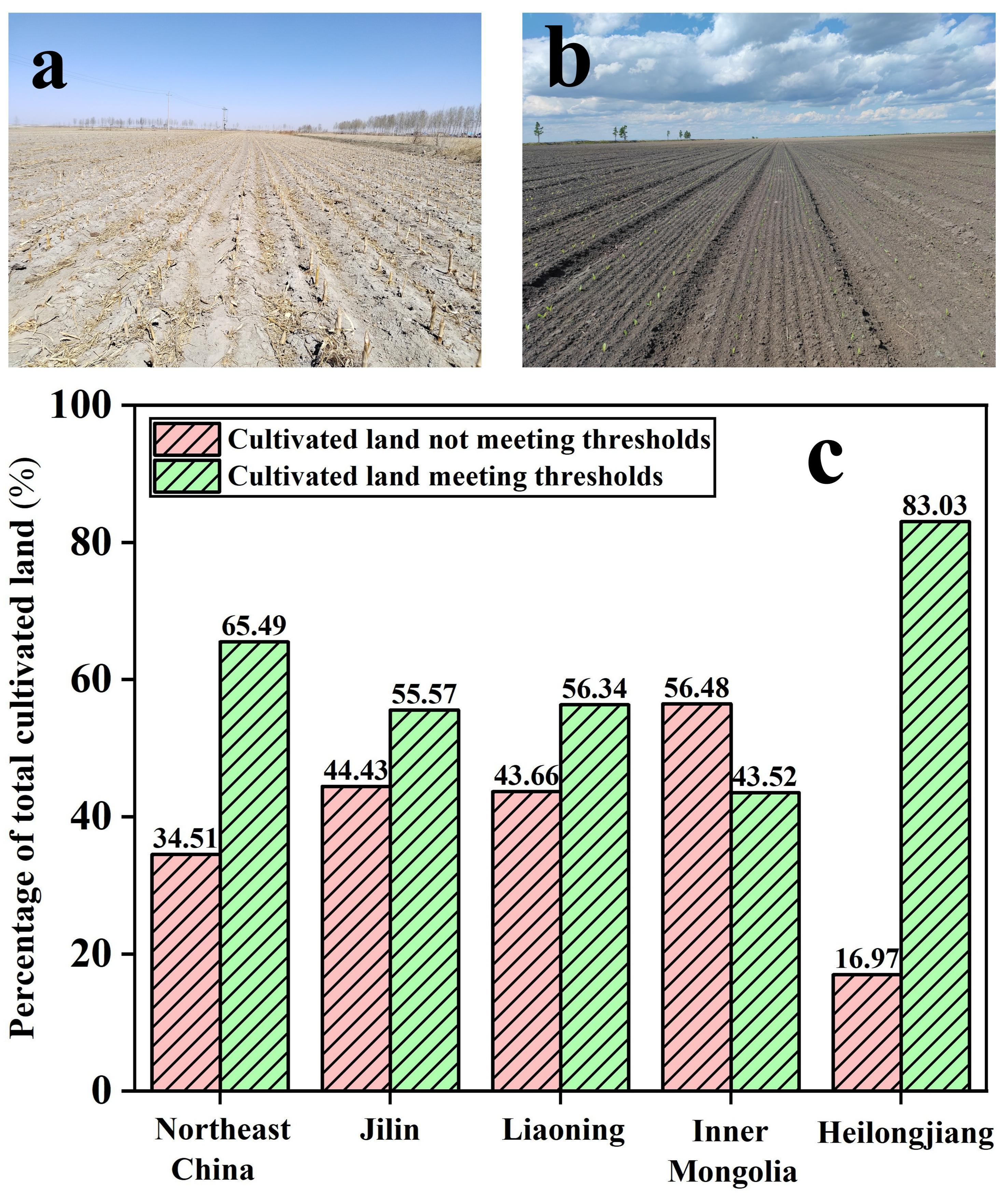 圖2.研究區(qū)SOM閾值空間分布差異圖。(a)2023年4月拍攝的鹽堿地照片;(b)2023年4月拍攝的黑土區(qū)照片;(c)柱狀圖顯示東北地區(qū)及四個(gè)省級(jí)行政區(qū)SOM含量達(dá)到閾值標(biāo)準(zhǔn)的耕地比例。