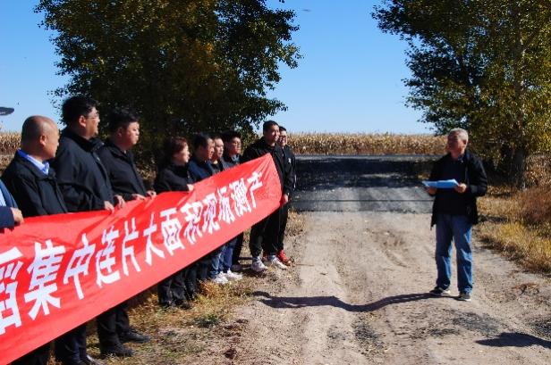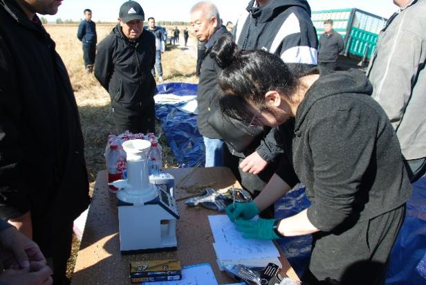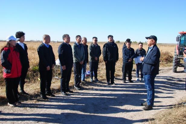 在扎賚特旗圖牧吉鎮青龍山嘎查的重度鹽堿地新墾稻田示范點,黃立華研究員簡要介紹了該區域的土地特點,這里的土壤90%以上為重度蘇打鹽堿土,開墾前土壤平均pH達10.17,全鹽量在0.5%以上,主要養分含量水平較低,科研人員在這里主要實施了降堿擴容技術,通過撒施磷石膏降低土壤堿化度,增施農家肥提升有機質含量,輔助施用微生物菌劑活化土壤,提高養分有效性等,經2年的技術示范應用,土壤pH平均降至9.6左右,土壤養分含量也得到顯著提升。經現場大面積機收測產、稱重去雜、折算成14.5%標準水后,應用重度鹽堿地降堿擴容種稻技術的田塊水稻產量達到327.26公斤/畝,農戶常規種植(對照田塊)水稻產量僅為156.58公斤/畝,增產了109.0%,增產效果顯著。技術示范依托企業--扎賚特旗五道河子農牧專業合作社負責人、全國人大代表杜崗表示,該技術的應用為周邊重度鹽堿地改良種稻和糧食穩步增產發揮了很好的科技示范作用。
