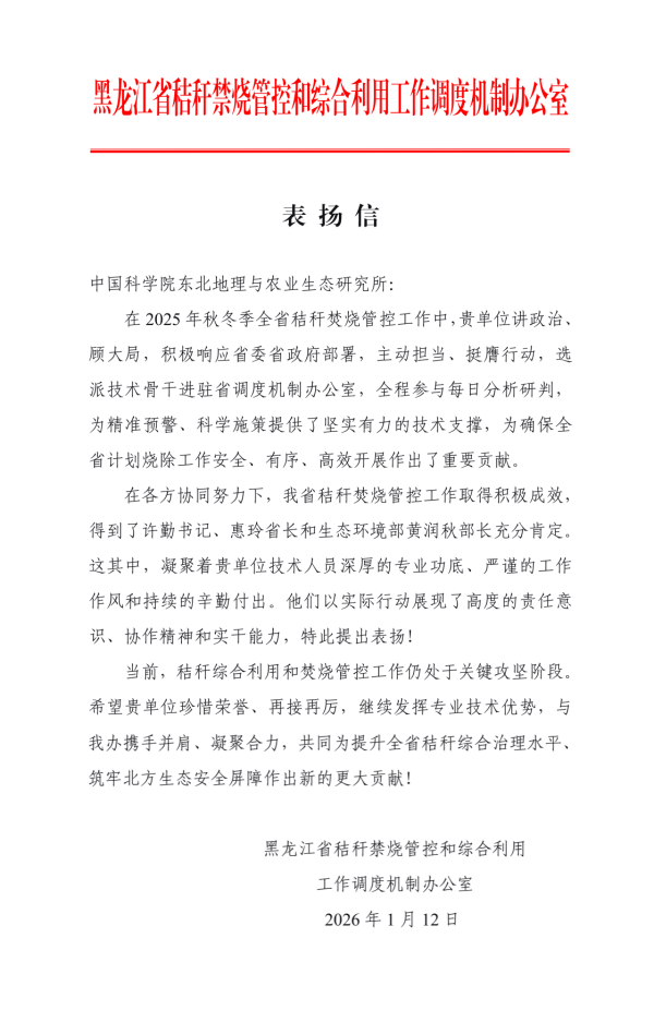 近日,黑龍江省秸稈禁燒管控和綜合利用工作調度機制辦公室以信函形式對中國科學院東北地理與農業生態研究所予以表揚,對東北地理所在2025年秋冬季秸稈焚燒管控工作中的重要貢獻表示感謝。濕地與全球變化學科組陳衛衛研究團隊參與構建黑龍江省秸稈數智化管控平臺,并選派技術骨干石博文、王梧陽、邢文甫等人全程參與省級調度和分析,為精準預警和科學施策提供了關鍵科技支撐。