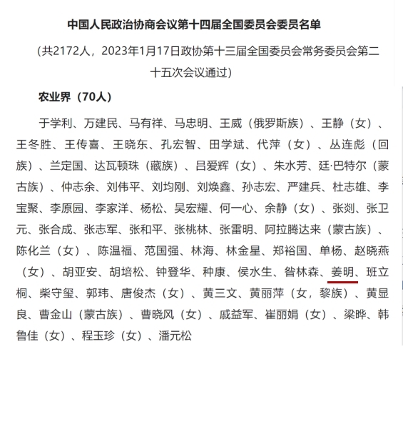 政協第十四屆全國委員會委員共2172人,分別來自34個界別,姜明是農業界別當選70名委員之一。