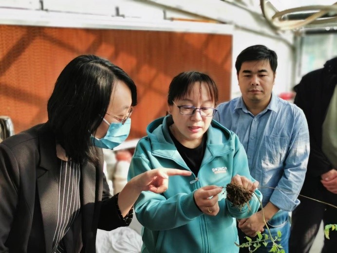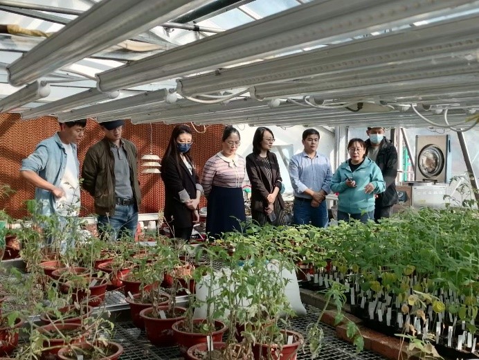 小組成員首先參觀了農田有害生物控制學科組的溫室試驗,學科組副組長李春杰研究員以大豆根腐病、孢囊線蟲病、大豆食心蟲和地下害蟲等為例介紹了大豆土傳病害、大豆蟲害的癥狀、傳播途徑和危害等等,并且針對不同的大豆病蟲害,李春杰又介紹了相應的綠色防控技術,如用自主研發的昆蟲病原線蟲制劑防治地下害蟲,間套作模式及生防細菌防治土傳病害,目前這些生物生態控制作用機制已逐漸明確,相應的技術也已示范推廣應用。