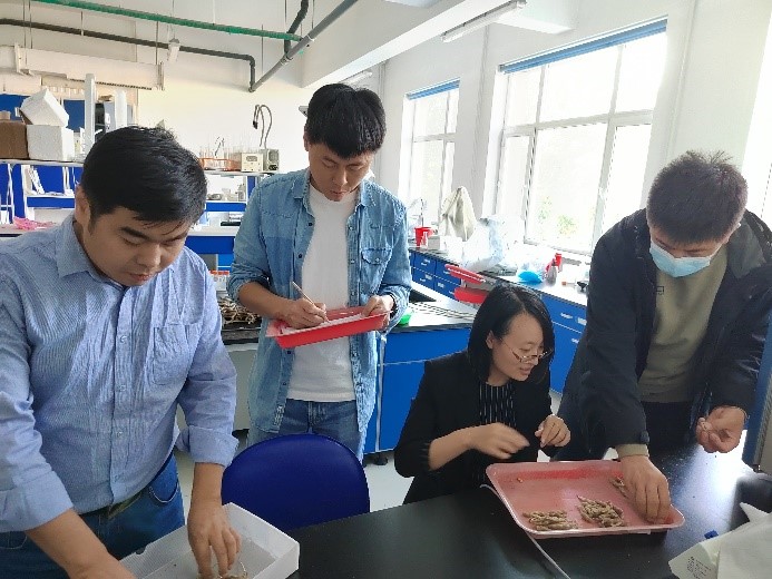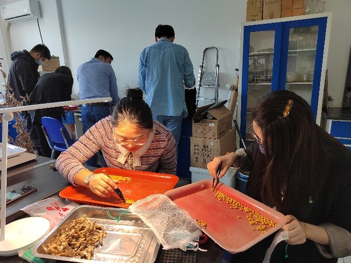 隨后,小組成員來到農田有害生物控制學科組的實驗室,李春杰為大家講授了大豆考種的目的、流程和方法,經過簡單的分工后,大家開始流水線式操作,記錄、測量、脫粒、分類,協助李春杰完成了2022年大豆考種的部分工作。